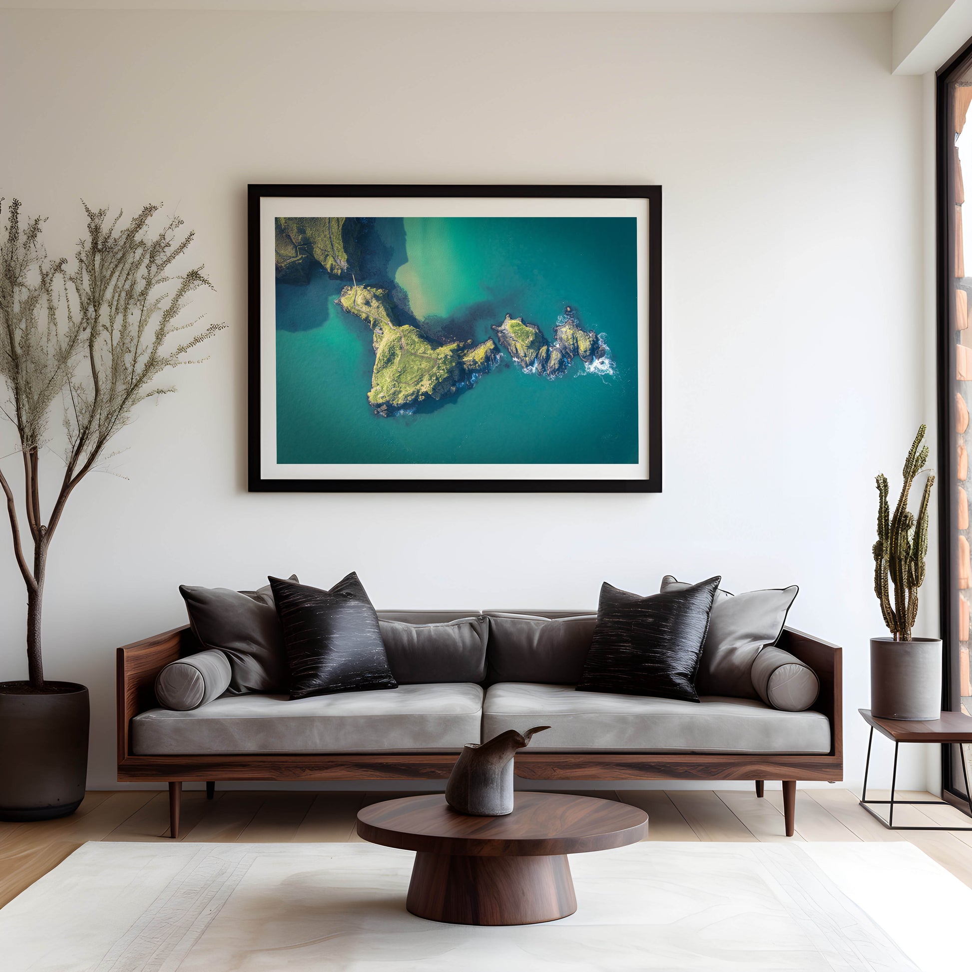 Gaze out at the churning Atlantic waters and towering cliffs of Northern Ireland's Antrim Coast in this awe-inspiring fine art print. The Carrick-a-rede Rope Bridge has captivated adventurous souls for centuries, and now you can experience its thrilling vistas from the comfort of your own home. Display this print to infuse your space with a sense of wonder and wanderlust.