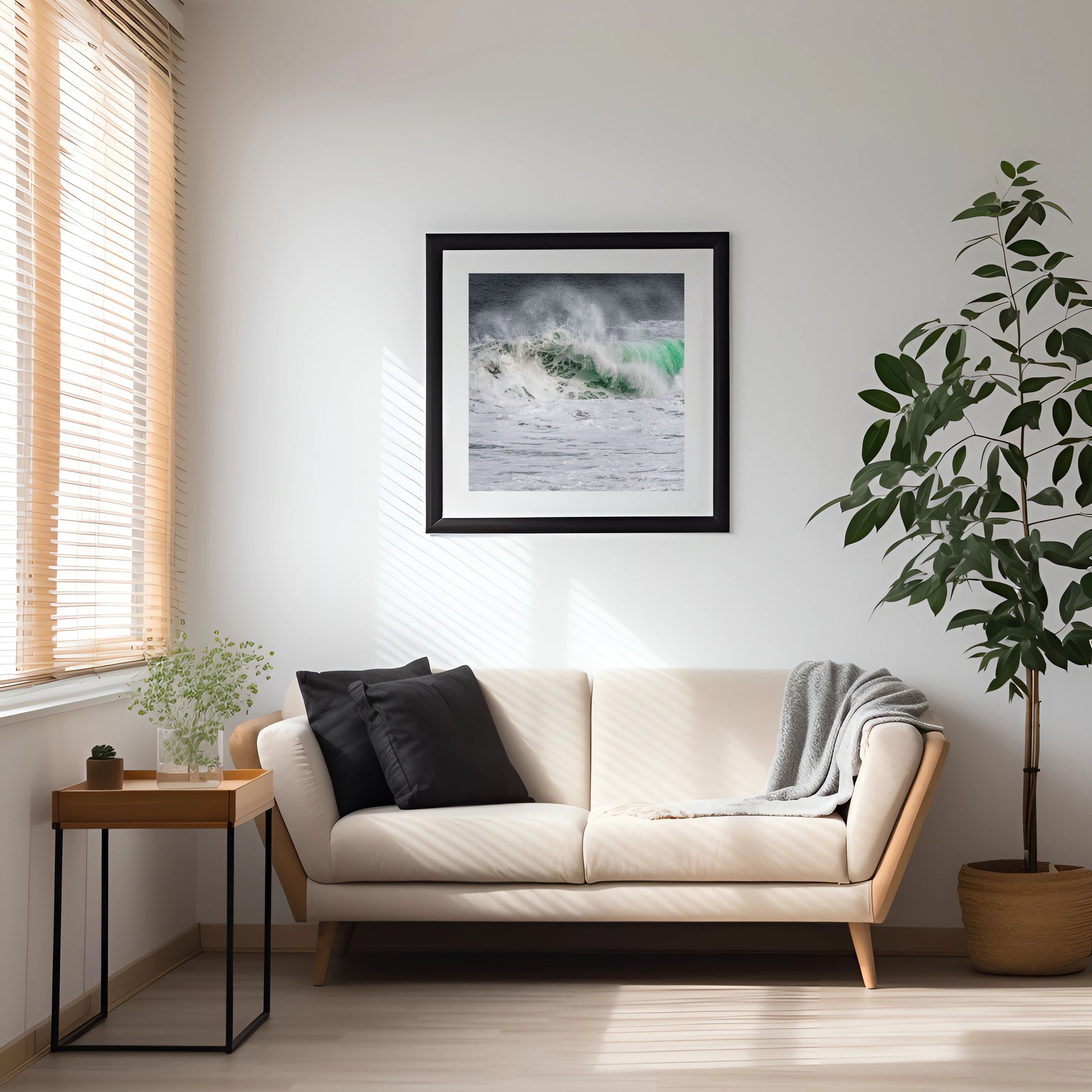 The dynamic energy of the waves gliding effortlessly atop the rolling waves showcases the perfect harmony between man and nature. The vibrant tonal colours of the ocean contrast beautifully with the lush greens of the coastline, creating a visual feast that transports you to this exhilarating moment in time.