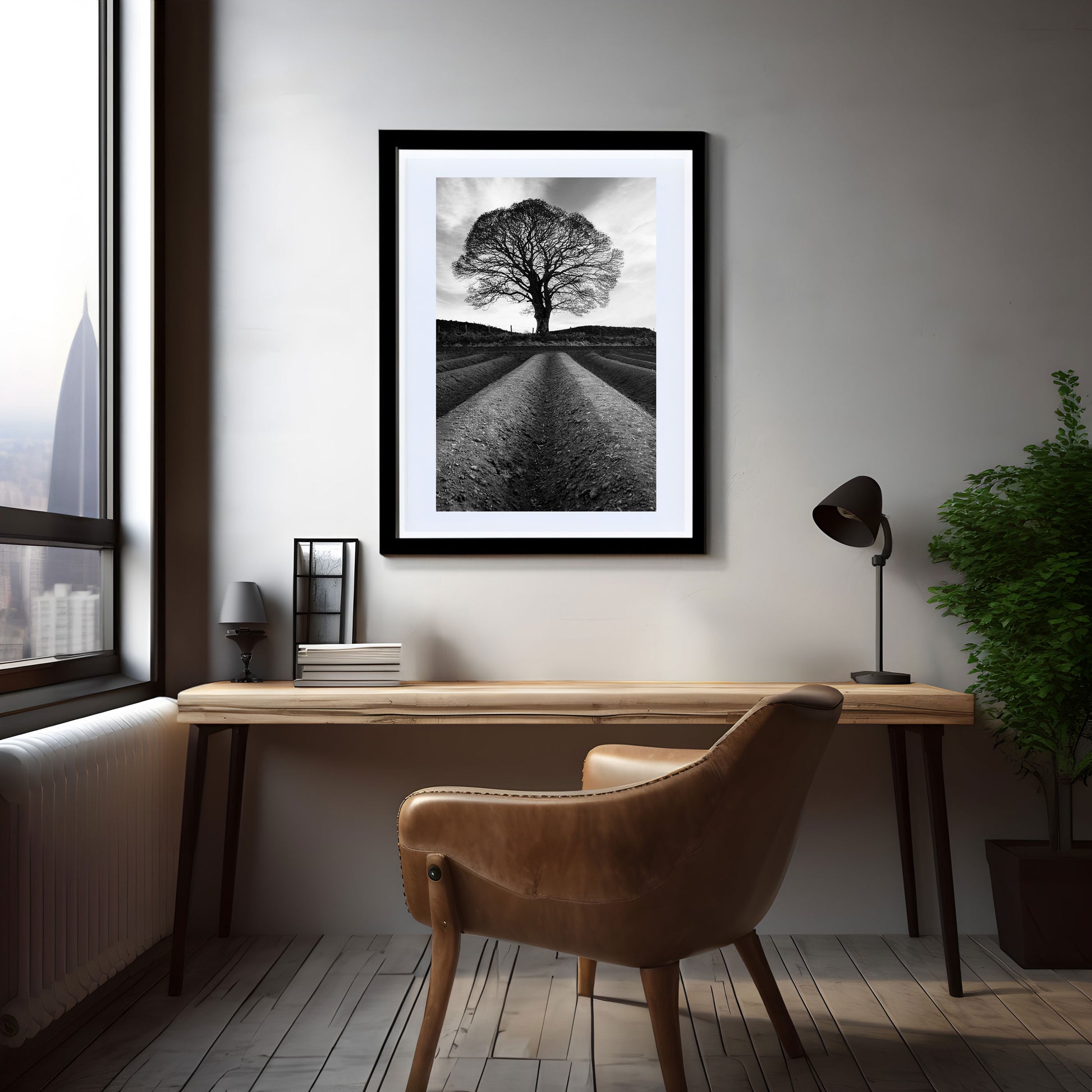 Black and white photograph. This captivating image captures the essence of nature's resilience, showcasing a solitary tree standing tall amidst an expansive field. The monochromatic tones enhance the dramatic contrast, making it a perfect addition to any space that seeks to evoke contemplation and tranquility.