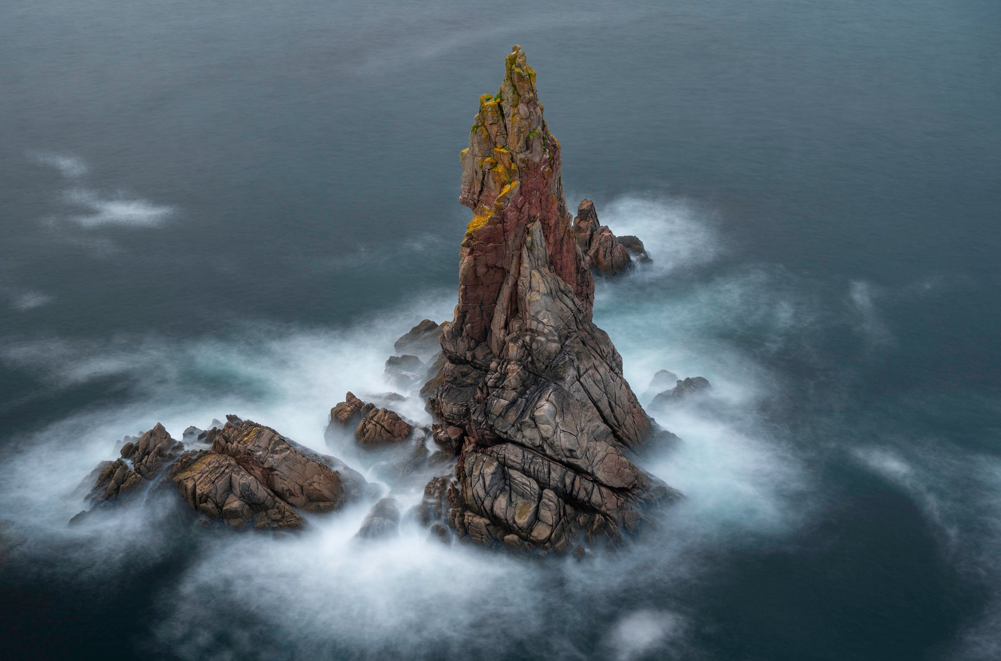 Tory Island Sea Stacks, a stunning natural formation located off the rugged West Coast of Ireland. This cliff top view captures the dramatic interplay between the rocky outcrops and the vast expanse of the Atlantic Ocean, showcasing the intricate textures and colors of the landscape. The long exposure technique employed in this image enhances the ethereal quality of the scene, softening the waves as they crash against the jagged rocks, creating a mesmerizing contrast between the solidity of the sea stacks and the fluidity of the water. The rich hues of the ocean, ranging from deep blues to vibrant greens, are beautifully complemented by the earthy tones of the rocks, making this image a striking representation of Ireland's wild coastal beauty.
