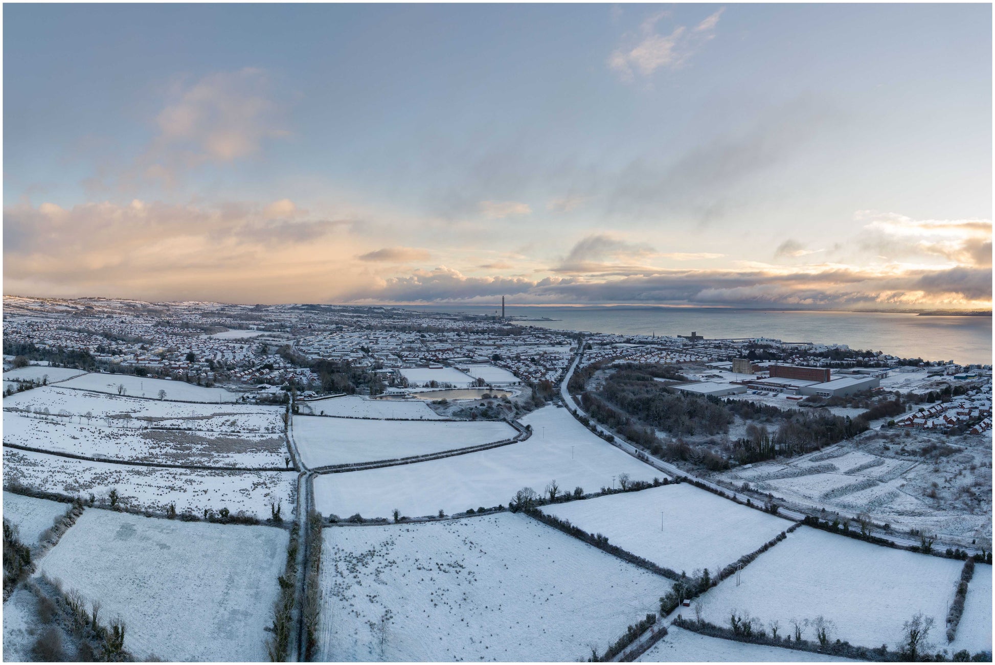 Carrickfergus in winter with this stunning aerial view of snow-covered fields and shimmering water. This captivating image captures the serene landscape, showcasing the delicate contrast between the pristine white snow and the tranquil blue waters.